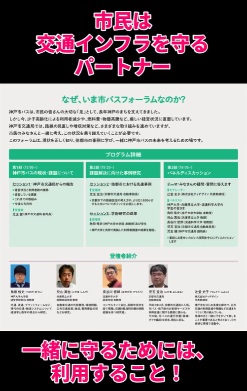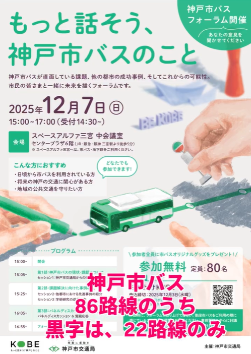 神戸市バスフォーラムに参加しました! 赤字路線の方が多いという説明を受け、 路線を守るためには、1走行35名以上の利用が必要 とも知りました。