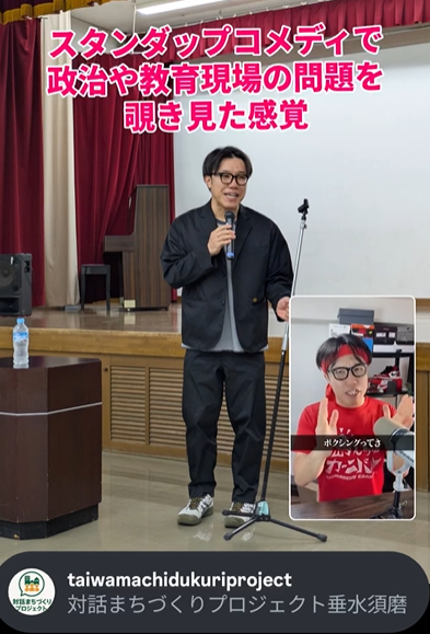 スタンダップコメディ(マイクを片手にコメディアンが1人でステージに立ち、観客に直接語りかける話芸)です。
